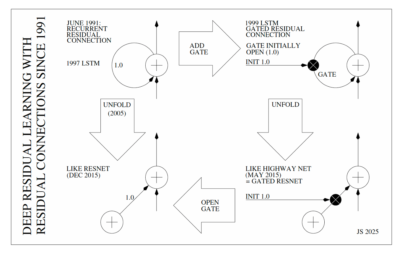 This distinction is critical because, as researcher Alex Graves later demonstrated, time is depth. When you unfold an LSTM through time, it becomes indistinguishable from a very deep feed-forward network. The massive success of LSTMs proved a hypothesis that would define the next two decades of AI: Depth itself was never the killer. Signal loss was.