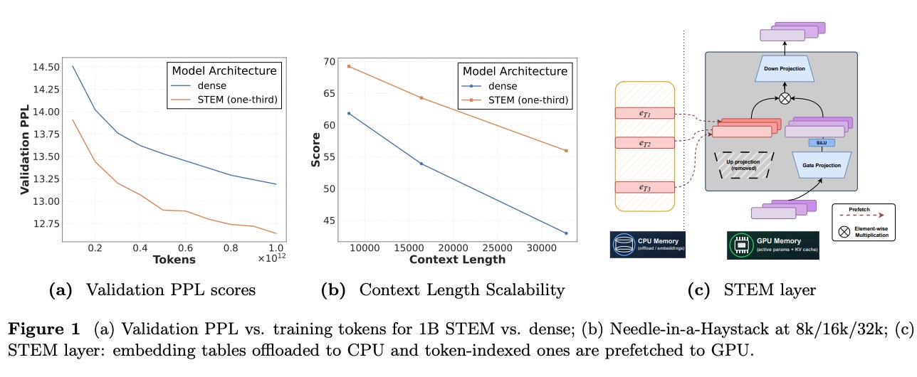 Researchers from Carnegie Mellon and Meta AI proposed STEM, a fine-grained sparse transformer that replaces FFN up-projection with token-indexed, layer-local embeddings. This design reduces per-token FLOPs by up to one-third, increases interpretability, and enables knowledge editing via embedding swaps. It achieves 3–4% accuracy gains at 350M and 1B scales, with up to 13% improvement on long-context benchmarks. STEM scales capacity with context length and improves knowledge-intensive tasks like ARC-Challenge and OpenBookQA. It’s significant because it scales model capacity and interpretability without increasing per-token compute, enabling more efficient, controllable, and knowledge-rich LLMs →read the paper